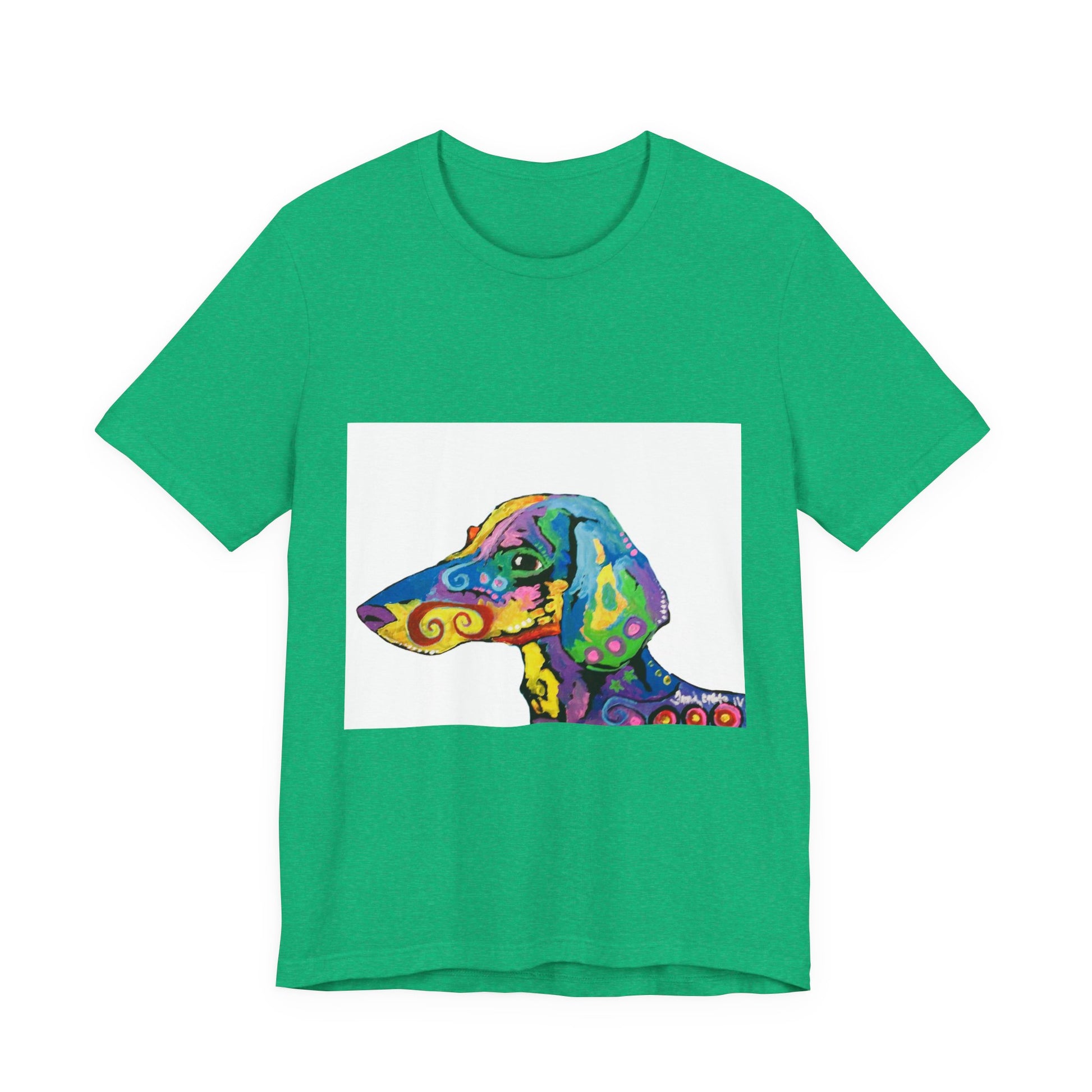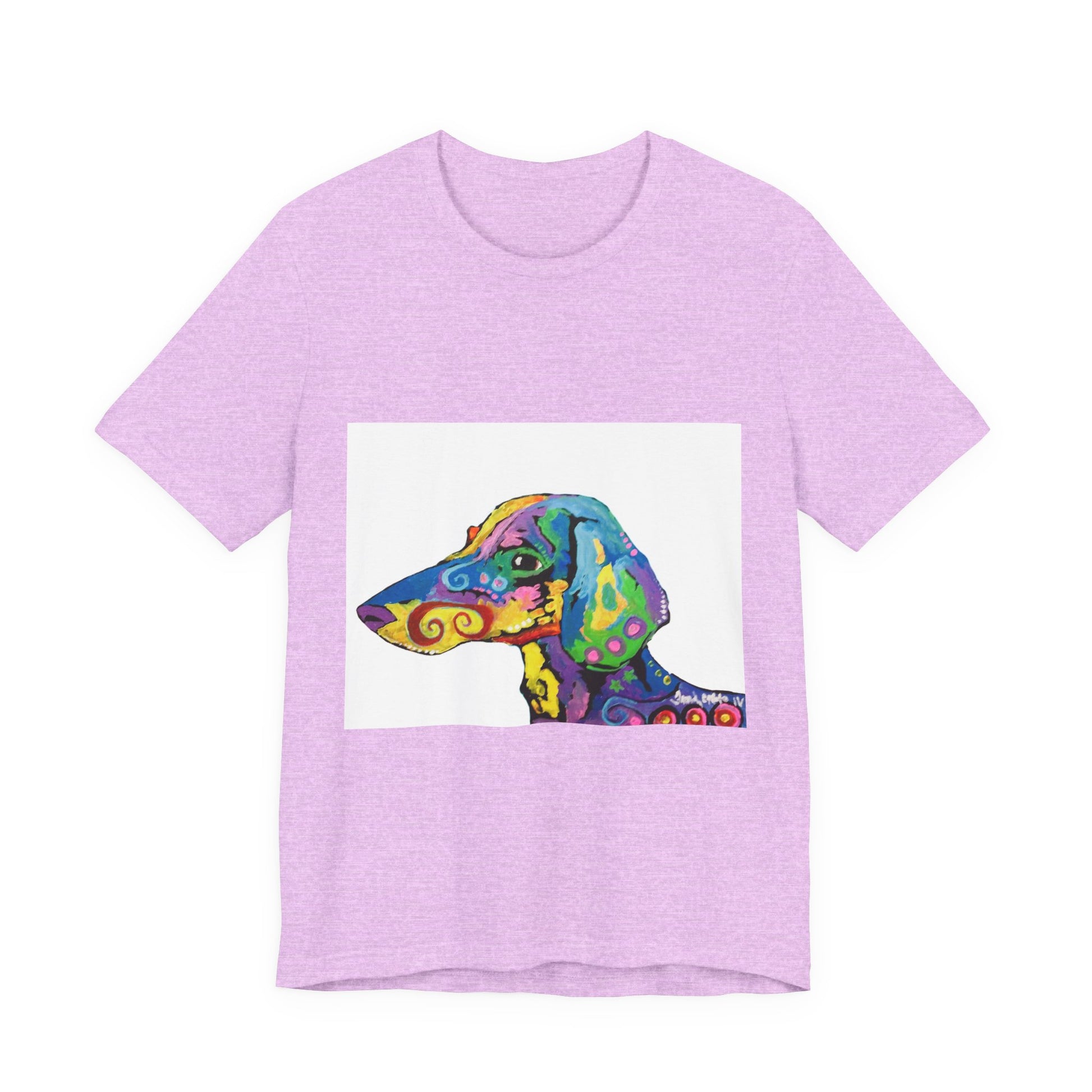 T-shirt featuring a painting "Rainbow Dachsund" originally painted by Mississippi artist Frank Noto. Experience comfort and creativity with this stylish Unisex Jersey Short Sleeve Tee. Crafted from 100% Airlume combed and ring-spun cotton, this lightweight shirt feels soft against the skin, making it perfect for both active adventures and laid-back leisure days. Its eye-catching, vibrant design of a colorful dog adds a playful touch, ideal for animal lovers and art enthusiasts alike. Whether you're going for a casual outing, a fun family gathering, or just lounging at home, this tee effortlessly fits into any situation. Celebrate special moments, holidays, or just express your unique personality with this versatile addition to your wardrobe.